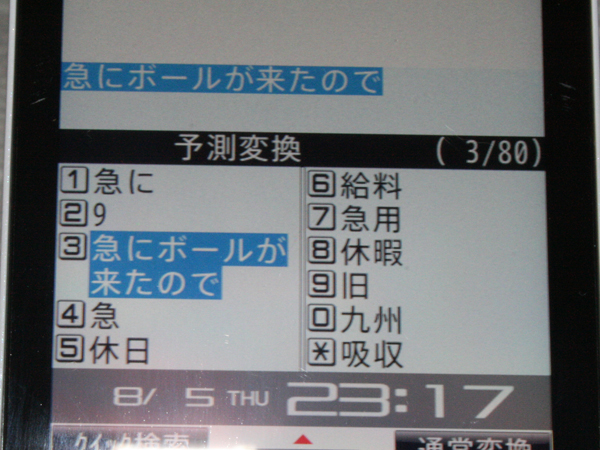 携帯の文字入力のアシスト機能に 『変換学習機能』というのが大体あって 文字を入力すると、よく使う表現や漢字の候補が 窓の下の方に挙がってくる。 これはワシの所感に過ぎないのだけど この挙がってくる候補については 携帯の機種によって雲泥の差がある気がする。 ワシの携帯は○ャープ製で、手にしてから1年経ったのだけれども、 このコが提案してくれる候補のセンスには未だに全く慣れない。 そして今日の帰り道。 ついったでつぶやいた『急に放流したわかぞうの・・・』云々を入力するとき 『きゅうに』と入力したワシに、このコはビックリするような候補を1番最初に挙げてきた。 (写真は『急に』を入力した後に、もっかい家でやってみた結果なので3番目だす) 『急にボールが来たので』 ・・・は?なんですと? ハテ?ワシ、いつの間にそんな文入力したっけ・・・? そもそも、この後にどんな結末があるの・・・? 昼間のケオスとの闘いで疲れ切っていたワシの脳みそはしばし固まったです。 このコは、直前に入力された言葉を覚えてくれるという気は全く利かず、 何回かしつこく入力したり、ユーザー辞書に登録したりすると ようやく『しょうがねぇな』って感じで、候補の前の方に挙げてくれるので、 100歩譲って、以前ワシが1回や2回、件の言葉を入力した可能性があったとしても、 たったそれだけで、しかもワシが覚えていないぐらい以前の話だろうから、 第一候補に挙げてくれることは、経験上あり得ないのです。 ってことは、デフォルトで既に候補に入っていた可能性の方が大きいワケで、 そうなると、余計にワシの超スペック低な脳みそは混乱するのです。 一体何のためにそれを候補リストに入れた・・・? 後に続く文を色々考えてみるワシ。 『打ってみた』とか・・・『避けちゃった』とか・・・ウーン・・・むつかしい・・・。 そんなこんなでもう寝ます。オヤスミナサイ☆ |
